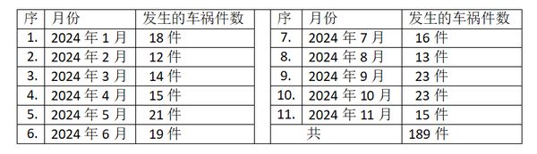 仰光—曼德勒高速公路上,在2024年1月1日至11月30日这11个月期间共发生了车祸事件共189件。