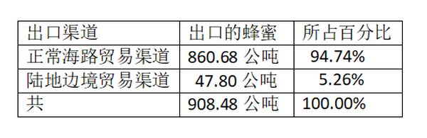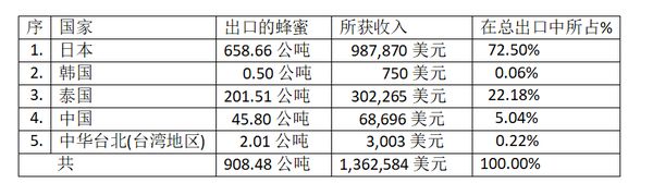 在这样出口时,主要出口到日本、韩国、泰国、中国及中华台北(台湾)等国家和地区,向各个国家地区出口的蜂蜜及所获得的收入如下表: