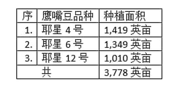 额别县区在现2024—25财政年度冬作物种植季期间规划种植鹰嘴豆作物5,974英亩,直到12月23日之时已种植了这作物3,378英亩,完成规划面积63.24% 的种植工作。这些种植的鹰嘴豆,品种主要为耶星(Ye-zin)4号、耶星6号及耶星12号这3个品种,各品种种植面积分别如下: