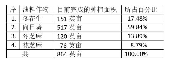 目前完成的种植面积中,以向日葵种植面积为最多,占了目前种植的所有油料作物种植面积的近五分之三的比例,其次是冬花生,目前其种植面积占所有油料作物种植面积六分之一以上的比例。