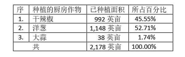 目前完成种植工作的厨房作物中,以洋葱种植面积为最多,干辣椒次之。