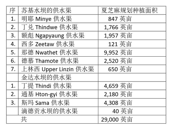 据2月26日出版的《苗瓦底报》报导,曼德勒省皎栖(Kyauk-se)县区为满足本地区民众们对食用油的需求,利用本地区的苏基(Zawgyi)水坝、金达(King-tha)水坝及滴德贡(Thit-ta-gon)水坝,规划种植夏芝麻29,000英亩。各水坝及其等的供水渠负责供应水源的农田面积如下表: