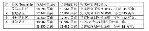 茵马宾专区内的4个县区—茵马宾县区、甘尼(Kani)县区、沙林基(Sa-lin-gyi)县区及波勒(Pale)县区规划种植的向日葵面积及目前完成的种植面积如下表: