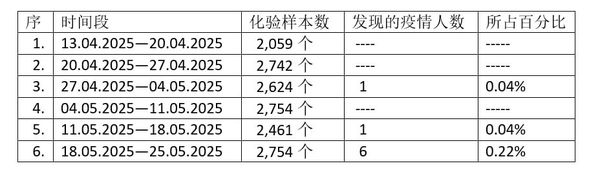 ,卫生部于5月26日晚上8点发出公告,在5月18日晚上8点是直到5月25日晚上8时这一周时间内,对2,754个化验样本进行检测,发现了6名新冠疫情确诊者。