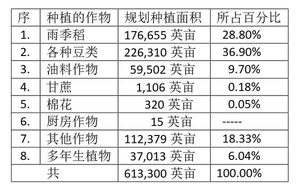 这些规划种植的各种作物中,雨季稻将在6月中旬开始犁地、育秧等工作,6月下旬开始全面种植工作。其他作物中,有的在5月初就开始有关种植工作,到目前为止各种豆类已种植11,606英亩,油料作物2,806英亩,甘蔗323英亩,其他作物3,024英亩。