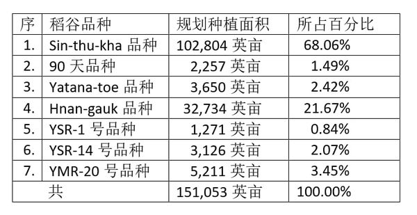 规划种植的稻谷品种主要是这7种,其中以Sin-thu-kha这一稻谷品种的规划种植面积为最多,占所有稻谷种植面积的三分之二以上的比例。其次是Hnan-gauk品种稻谷,其规划种植面积占所有稻谷种植面积的五分之一以上的比例。