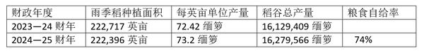 可以发现,在2024—25财政年度雨季时期,全省稻谷种植面积比上财年少321英亩,但因为每英亩单位产量增加0.78缅箩,所以稻谷总产量增加15万缅箩,粮食自给率达到74%。稻谷单位产量每英亩73.2缅箩时,全省粮食自给率达到74%,如果全省的稻谷单位产量都能达到指标产量每英亩100缅箩的话,则粮食自给率就可以达到100%。所以在全省范围内扩大稻谷种植面积有困难的情况下,如果能提高每英亩的单位产量之话,德林达依省同样有望实现粮食自给自足。