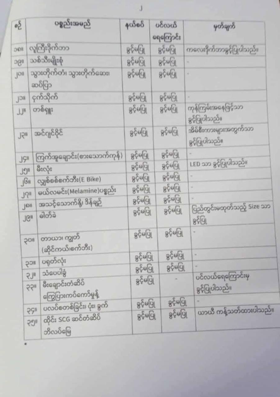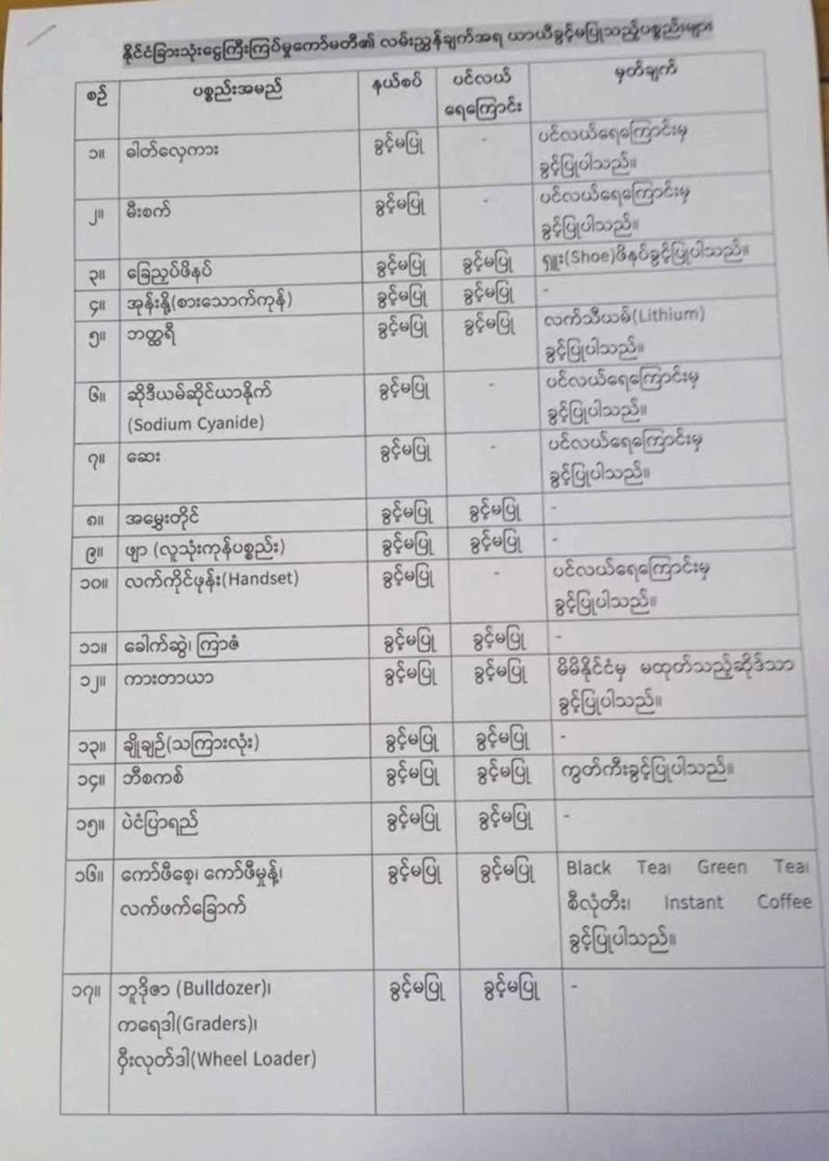 缅甸社交媒体近日流传一份关于35种禁止临时进口商品的指导文件,经查实该文件实为2022年发布,目前尚不确定其是否仍然有效……