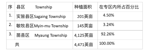 3个县区中,以苗县区种植面积为最多,占全专区夏芝麻种植面积的9成以上的比例。而且只有该县区种植面积达到4千英亩以上,其他2个县区种植面积只有几百英亩,可以说是“微不足道”。这可能是这2个县区在过去的冬作物种植季节期间已种植了大量的芝麻作物。敏牧县区在这冬季期间种植冬芝麻37,412英亩,每英亩产量为13.77缅箩(见《缅华网》4月26日“缅甸新闻”栏目中的有关报导),而实皆县区在这冬季期间同样种植了冬芝麻40,240英亩(见《缅华网》1月14日“缅甸新闻”栏目中的有关报导)。由于在这冬季期间种植了大量的芝麻,夏作物种植季节期间芝麻作物种植面积就减少了。