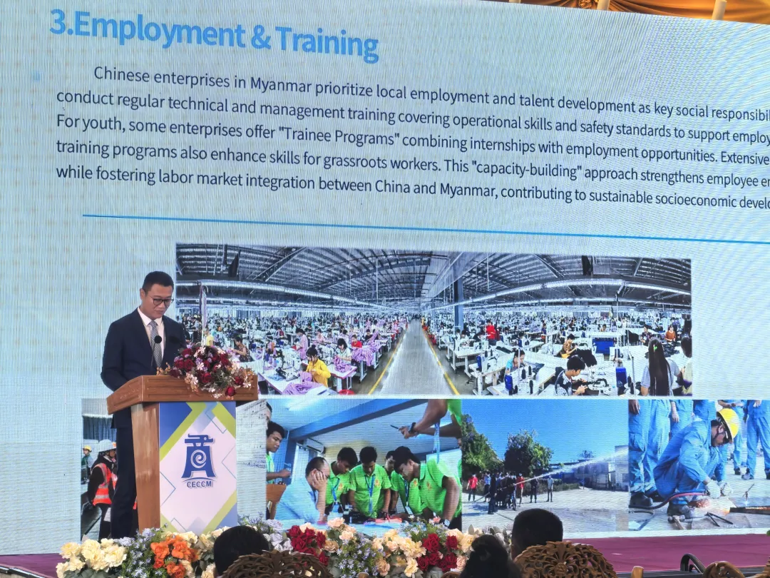 中国驻缅甸大使马珈致辞表示,中国长期保持缅甸第一大贸易伙伴地位,在共建“一带一路”倡议下,中缅两国实施了一系列惠及双方人民的项目。中国企业作为中缅合作的关键参与者与推动者,在能源、基础设施、制造业等多个领域积极投资,累计为缅甸创造超300万个就业机会,惠及数百万家庭,其中女性雇员占比近60%,为缅甸经济社会发展贡献巨大。