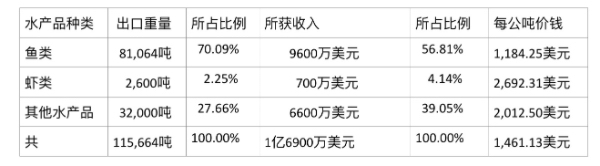 三大类水产品中,以鱼类出口量为最多,占了所有水产品7成以上的比例,但所获收入仅占所有水产品出口的五成半多的比例而已。这是因为鱼类出口每吨只获得1,184美元的价钱,虾类出口每吨可获得2,692美元,其他水产品每吨出口平均可获得2千多美元之故。