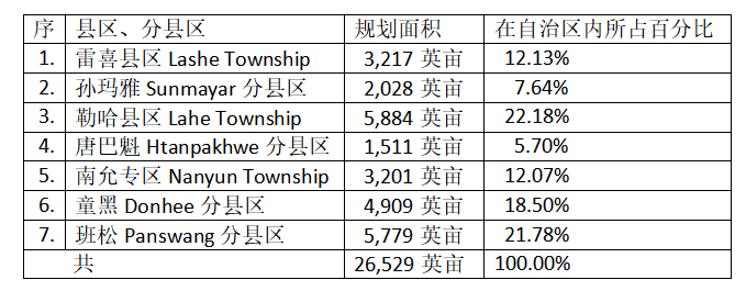 目前那加民族自治区内各县区完成的雨季稻种植面积如下表: