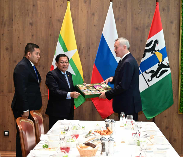 会谈期间,国家安全与和平委员会主席用从缅甸准备好的传统食物——茶包、奶茶以及即食烩鱼(ငါးသလောက်ပေါင်း)进行款待。新西伯利亚州州长及成员愉快地享用了这些美食,并且还介绍了缅甸传统饮食文化。会晤结束后,双方互赠了礼物。