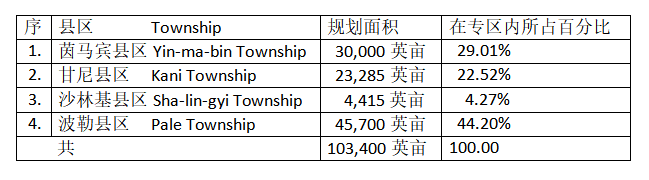 茵马宾专区内的4个县区—茵马宾县区、甘尼(Kani)县区、沙林基(Sa-lin-gyi)县区及波勒(Pale)县区2025—26财政年度所规划种植的雨季稻面如下表: