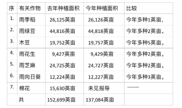 去年种植的雨作物种植面积与今年的雨作物种植面积比较如下: