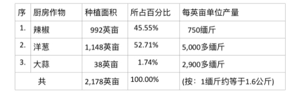 按:在过去的2024—25财政年度冬作物种植季节期间,本漂县区方面也曾种植了厨房作物2,178英亩,但当时所说的厨房作物只包括辣椒、洋葱及大蒜这三种,并没有包括蔬菜在内。去年种植的各厨房作物种植面积及每英亩的单位产量如下表: