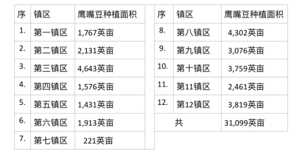 县区内的12个镇区,每个镇区所种植的鹰嘴豆面积如下表: