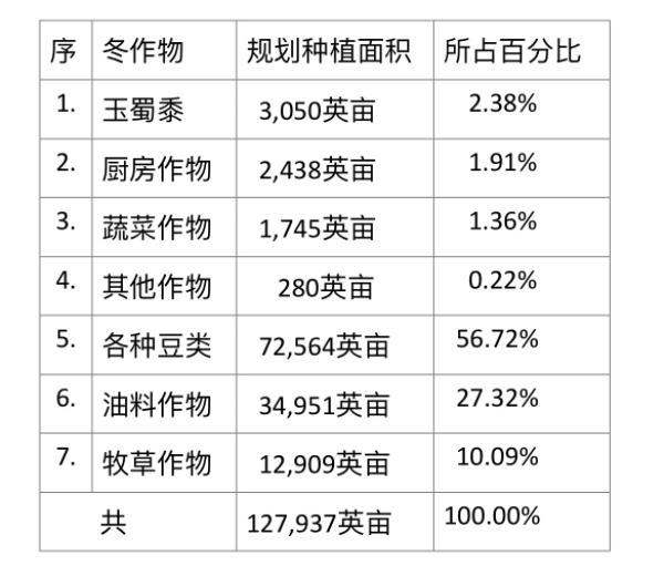 本漂县区现财年冬作物季节期间种植的各种冬作物面积中,以各种豆类及油料作物规划的种植面积为最多。豆类作物规划种植面积占了全部规划种植面积的一半以上比例,油料作物规划种植面积则占了超过 ¼ 的比例。