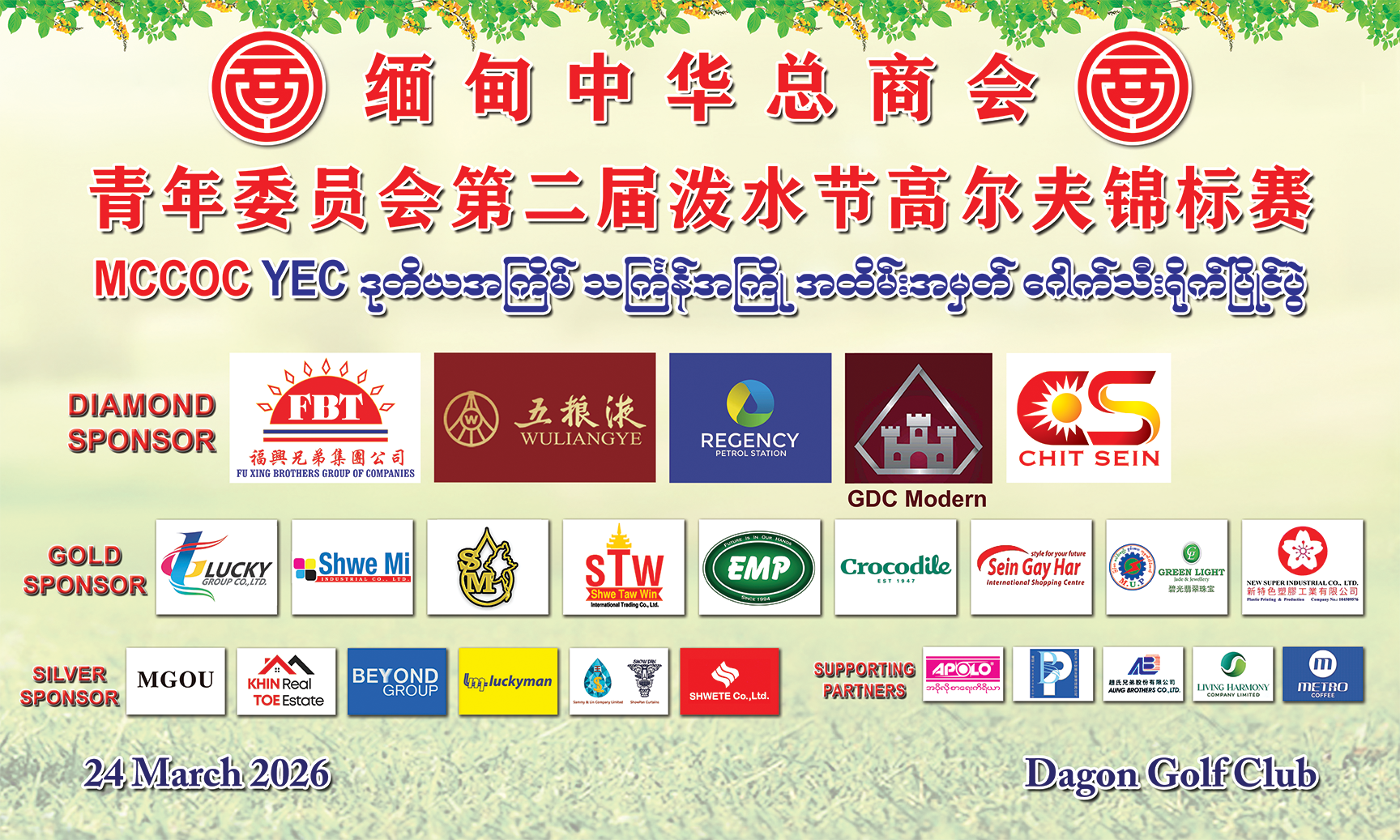 2026年3月24日,缅甸中华总商会青年委员会(MCCOC YEC)在仰光Dagon Golf Club举办第二届泼水节高尔夫锦标赛。本次活动延续了首届赛事“以球会友、共话友谊”的宗旨,再次汇聚了缅华各界精英与中缅友好人士,在优雅竞技中增进情谊,在交流互动中共谋发展。