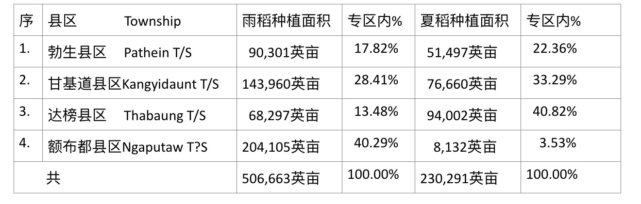 按:甘基道县区所在的勃生专区,是一重要的稻谷种植地区。该专区在雨作物种植季节期间种植了雨季稻50多万英亩;在现在夏季稻种植季节期间各县区也都大种夏季稻。各县区所种植的雨季稻面积及规划种植的夏季稻面积如下表: