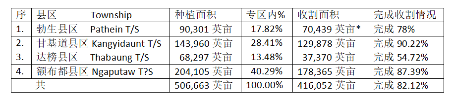 按:之前媒体上报导勃生专区雨季稻收割工作情况时,曾报导说甘基道县区完成了这雨季稻129,878英亩的种植工作(见《缅华网》3月25日有关栏目中的报导)。现在说完成5万多英亩收割工作,不知是哪一报导有误。当时报导勃生专区内各县区种植的雨季稻及目前完成收割工作的农田面积如下: