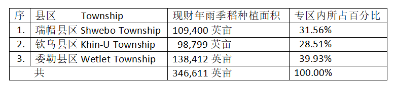 按:委勒县区是实皆省内一重要农业县,之前有媒体报导过该县区今年规划种植雨季稻139,600英亩,现在实际种植138,412英亩,算是完成规划种植面积99.15%的种植工作。而该县区所在的瑞帽专区,是实皆省内的一个主要稻谷种植地区,在现财年雨作物种植季节期间,专区内各县区所种植的雨季稻面积如下: