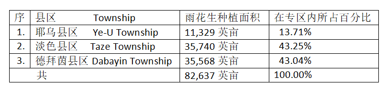 按:德拜茵所在的耶乌专区是一重要的油料作物种植地区,该专区内的各县区在今年雨季也种植了雨花生,各县区所种植的雨花生面积如下: