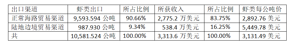 这样出口这虾类时,海路渠道出口占了九成以上的比例。边贸渠道出口的虾类重量不到总出口量的一成,但所获收入却占总收入的近六分之一比例。造成这样的原因,就是所获价钱不同所致。海路出口时,每公吨虾所获价钱仅为2, 892多美元,而由边贸出口时,每公吨价钱却是5,449美元,几乎是由海路出口时所获价钱的两倍。