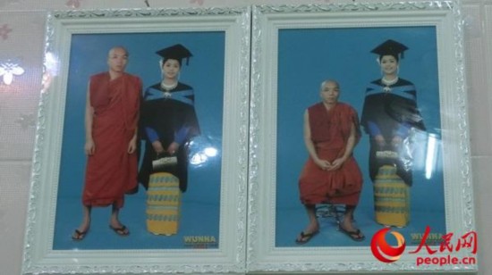 会客室的墙上挂着方丈与一名身着硕士服的学生的合影。方丈说,从这里毕业考上大学的学生有8名,还有考上硕士的。他们不少人毕业后重新回到这里当老师,“这里一共有16位老师,只有高中二年级和三年级的老师是外聘的。”