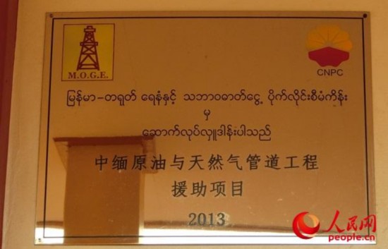 学校墙上挂着“中缅油气管道工程援助项目”标牌