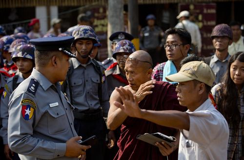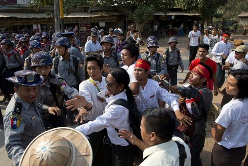 人民网网3月3日电 缅甸时间3月2日,缅甸礼勃坦,学生示威者欲加入在一寺庙内休整的大部队,对他们认为将妨碍学术自由的新法案进行抗议。遭到警方阻拦后,与警方发生对峙。当局为阻止由数百名学生组成的游行队伍向仰光前进而调集了大量警察。(实习生 王普聪)