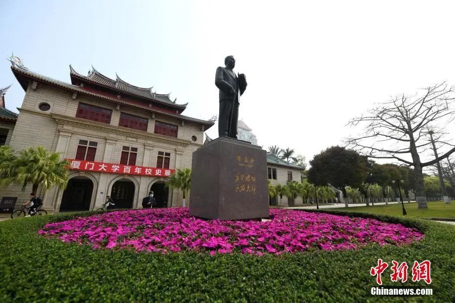 如今,在厦门大学群贤楼前广场中央,陈嘉庚雕像矗立,雕像基石上以金色大字雕刻着毛泽东对陈嘉庚的称誉:“华侨旗帜、民族光辉”。