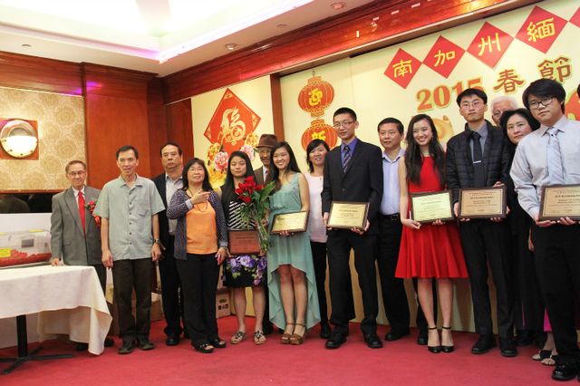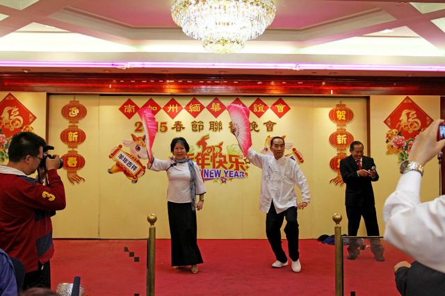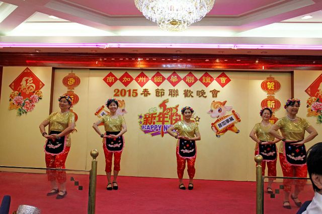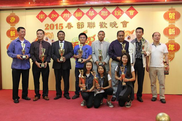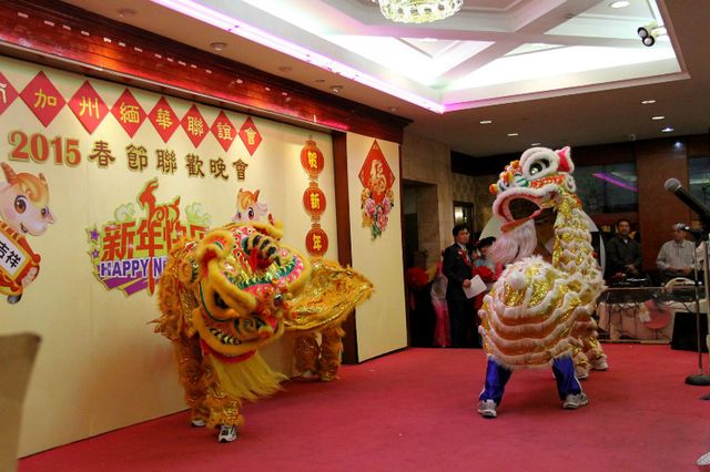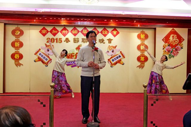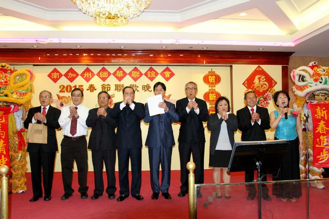 宴会主持人:朱徐佳小姐,杨灿云先生宣布南加州缅华联谊会庆祝二0一五年春节仪式开始,首由瑞狮队皆同该会全体董事和理事会同仁上台互相打拱作揖,面向来宾送福完成团拜仪式。后由会长黄国胜先生祝词:他向在座的来宾送上最诚恳真执的新春祝福,为扩大该会活动,今年将会设计增多年轻人喜欢的活动项目,把会务做好。赵美心议员向大众赠送了春的祝语之后,向该会董事长和会长颁送纪念状,许秉正董事长和黄国胜会长接受了纪念状,台下响起雷呜般的掌声。两位主持介绍了杰出人士:郭忠信先生,粟福祥前会长,并由董事长和会长向他们颁发了纪念状。仪式在该会副会长杜国和先生做财政报告后宣告结束。