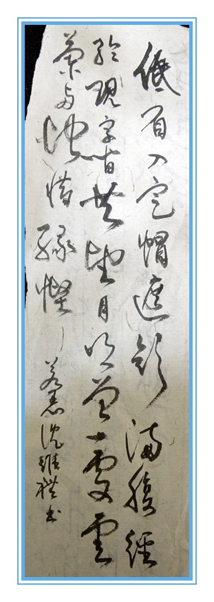 不久前,德基的台湾同事沈维礼先生从德基新书中的记述,了解我俩在缅华文学网的”奇遇”,拍案叫绝。沈先生特别将他在习字时,以我写给德基的诗作:”低眉入定帽遮颜,满腹经纶现字间,共望月明曾一处;云兰两地惜缘悭”为题,以草书自运为创作,传送给德基留念(见附图)。