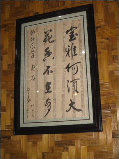 走进饭馆,便听见有顾客在说云南话,颇感惊讶和亲切,又见四壁席墙木窗,一副乡村民居风貌,而四面席墙上挂有几幅诸如“海纳百川”、“自信天生有傲骨,不在人前矮三分。”“室雅何须大,花香不在多”的书法作品,却让餐厅平添了几分古雅的气息。这时耳边飘来一曲悠悠扬扬的“小河淌水”的云南民歌。我一时迷迷茫茫,分不清自己是身在云南还是缅甸。