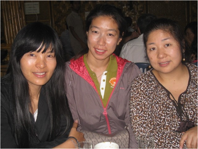 (三位笑靥如花的缅华青年女诗人。左起段春青、明惠云、棋子。)