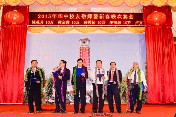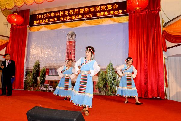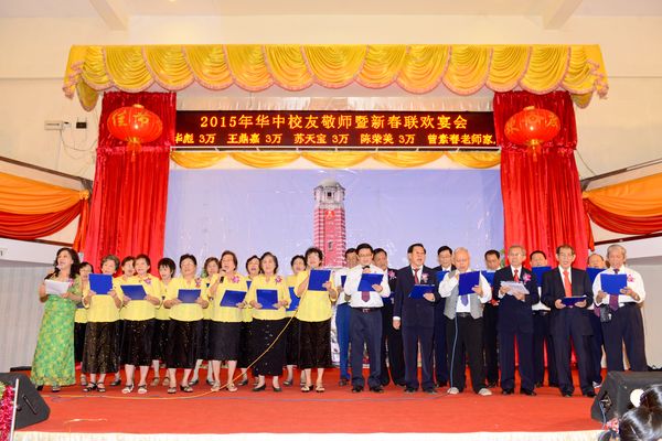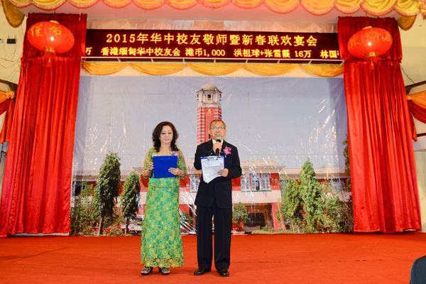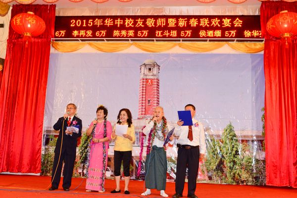 大金塔下,伊江之滨,生活着我们快乐的一群,我们锻炼坚强的体魄,我们学习基本的学问,辽亮歌声弥漫在仰光梅花皇宫大酒家,飞到天空,传到宇宙中,各地华中校友心连心,共同齐声唱响那心中经久不老的校歌。2015年2月28日晚6点半,缅甸仰光华中校友会,在梅花皇宫大酒家,举行新春敬师联欢晚宴,会场喜气洋洋,有来自缅甸各地,中国、香港、美国、泰国等地的华中校友,欢聚一堂,有述不尽的情感,共同回味那难忘幸福的时光,校歌拉开晚会的帷幕。祝愿大家羊年大吉大利,福寿康宁,财源滚滚来。
