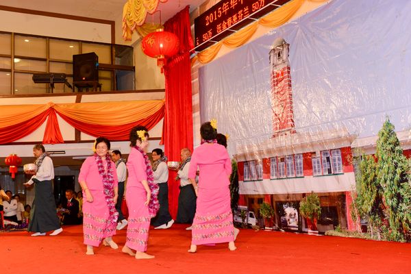 随后是文艺节目演出开始,这些演员都是六十岁以上的校友,为了这一场联欢晚会,他们在几个月前,抽出珍贵的时间,幸勤练习,累了脚痛了还是坚持练下去,这就是华中精神在支持着她们。所以演出成功,节目更是精彩,风韵万千展现在舞台上。苏金安老师来缅时曾经说过“这是一群不老的不倒翁在舞台上永远年青”。我们有雄伟的合唱,“祝福祖国”永远坚强蓬勃和“美丽的中国梦”,繁荣花盛开,深情向未来。还有蹦蹦跳跳的时代舞:“萧洒走一回” 、“往事只能回味” 、优美的歌伴舞“卓玛” 、老祖宗留下的一句话“家和万事兴” 、美妙双人舞“今宵共举杯” 、海外校友的独唱“红尘情歌” 、男高音歌手演唱“中华情” 、闽南歌歌伴舞“爱情恰恰” 、老歌手独唱“青年之歌” 、红歌星林清忠校友演唱的歌伴舞、还有人世间不如意事太多但只要欢喜就好“欢喜就好”的闽南歌小组唱、最吸引人的缅甸泼水节传统节日舞蹈和意义深刻的小组唱,“我的好兄弟” 、最后是今年最红最火的集体舞“小苹果”听到音乐节奏就会随歌舞动起来。台上的演员都让人不敢相信他们的年龄了,因为他们跳的多轻盈,多熟练,多美妙。轻飘飘的,台下阵阵的掌声鼓舞着他们,多姿多彩的节目一幕幕的吸引着观众们,使他们忘了该回家的时间,一直到所有演员上台唱出请把我的歌,带回你的家,请把你的微笑留下,情义深深,回味无穷,难忘美好的今宵。