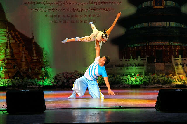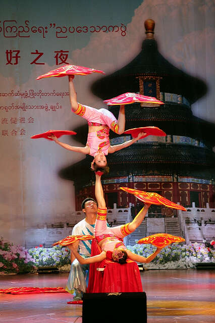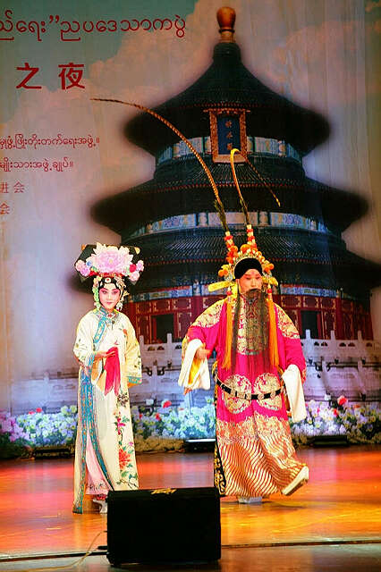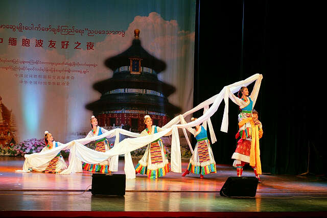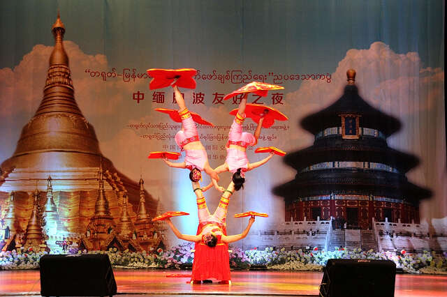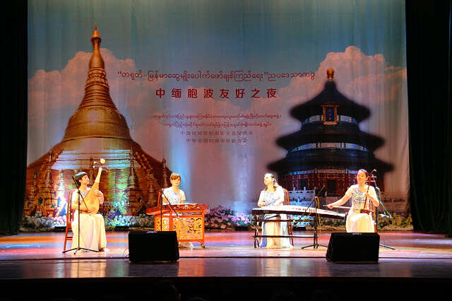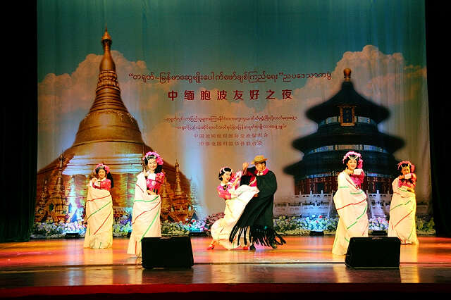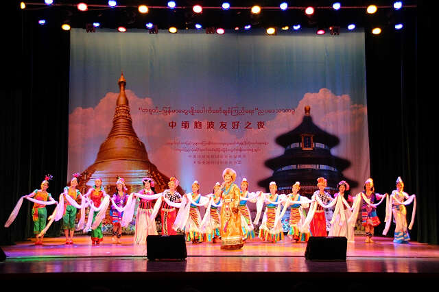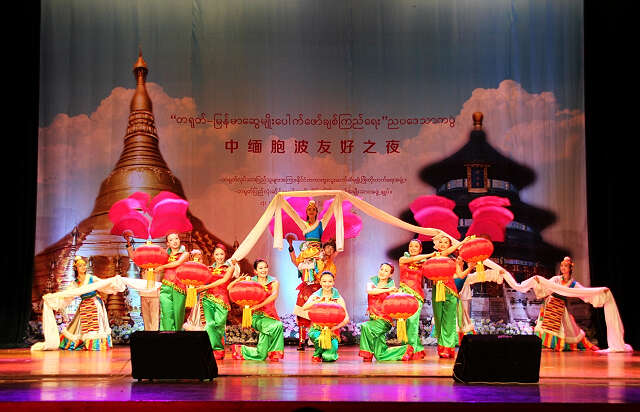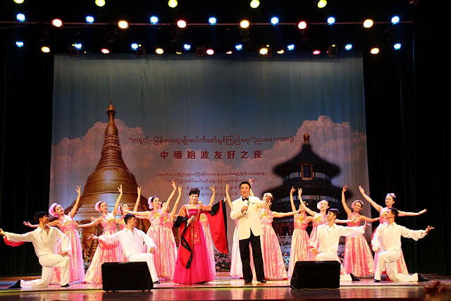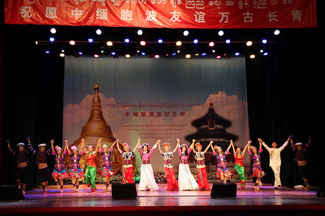 2012年5月15日-16日,中缅胞波友好艺术代表团在仰光国家大剧院举行文艺晚会,中共中央政治局委员、全国政协副主席王刚和缅甸仰光省行政长官吴敏瑞、巩固与发展党总书记吴泰乌等两国领导人,以及各国使节、缅甸友人等观看了文艺演出。艺术家们的精彩表演赢得了来宾们热烈的掌声……