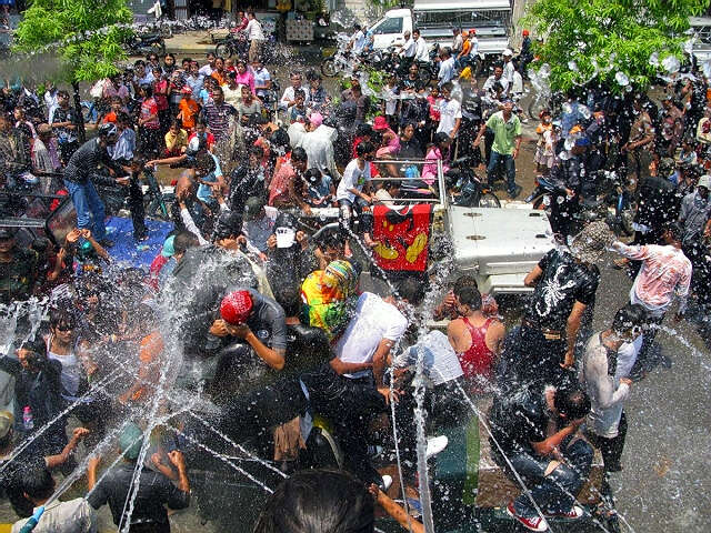 因水而愉,听瓦城人欢呼雀跃,欢乐的歌声在空气里振动,那是一种热情而嘹亮的,充满了祝福的声音,是一种确定的幸福归宿的流动。看皇城边水花四溅,纯净而清凉的水在这特殊的日子里也具有了特殊的意义,它不仅给人们带来了无穷的欢乐,也带来了美好的祝福。喷水的水管也随着美妙的音乐翩然起舞,带动着水花,将欢乐与祝福洒向人们,当带着欢乐与祝福的水花洒向人们时,人们欢呼着、舞动着,尽情的享受着这欢乐的洗礼。愉由水起,漫步情人桥,感受着古桥带给人们的厚重感和不时由脚底升腾至心底的清凉,迎面而来的全是嘴角上扬的脸庞。看着这坐落在湖上的长桥,在水中嬉戏的人们,让人真正的体会到水所带给人们的欢乐,仿佛水是上天赐予他们的礼物,而这礼物蕴含了幸福、欢乐与祝愿。在这神圣而盛大的节日,皇城与情人桥聚集了曼德勒欢乐的灵魂,那是人的海洋,欢乐的天堂。而散落在皇城各角落的欢乐精灵,也随着散落的水花,在人们的身边和心灵跳跃!