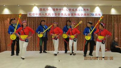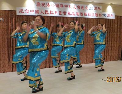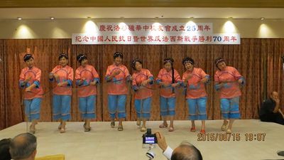 25周年庆在”爱我中华”的歌声中圆满落幕。回想当初能不能把沉寂了几年的华友活动从新振作都没多大信心。经过几次开会商讨,停顿了几年的华友活动终于决定了今年25周年与抗曰胜利70周年一齐同庆。可是该如何着手,以何种形式展现,一开始大家都毫无头绪,幸好没多久我们的智多星陈孙荣就拟定了晚会的大概方案,无疑是给大家注入了强心剂。在此也特别感谢孙荣在这几个月内对华友所付出的脑力和精力。由五月份干亊会决定举办周年庆,6月开始排练节目,在大家都巳坐六望七或巳进八的实际情况下,大家一致同意重演20多年来的経典节目。另外要把郭缅生老师在1960年带领 我们到中国表演过的织纲姑娘重现午台,为此我也倍感兴奋,原先想由秋玲负责此节目,后因她要分身照顾孙子,我只有奋身承担,重新由视频里学习以便带领6位新成员练习。50多年前跳过的午虽然不难,但因为是团体舞,节奏和舞步都要求整齐。为求完美,的确也花了番工夫 。同时还必须设计缝制这个舞蹈的服装 加上配撘饰件 以便能够呈现的尽善尽美,陈彩意帮忙买到了托人在缅甸都买不到的木屐,梁瑛金也 想方设法在纲上买到了鱼纲,谢谢大家的齐心合力。