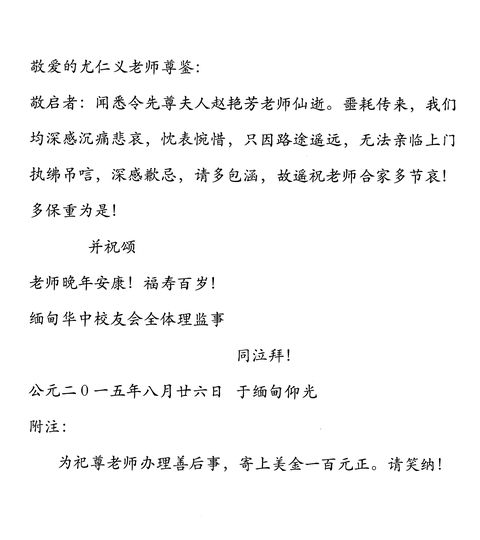 缅甸仰光华中校友会的慰问信