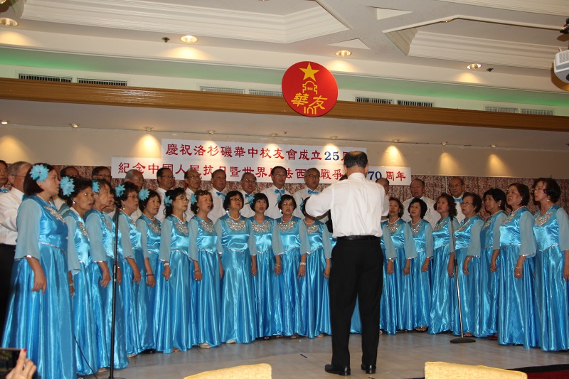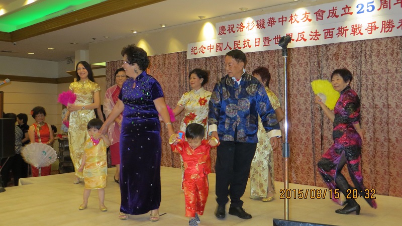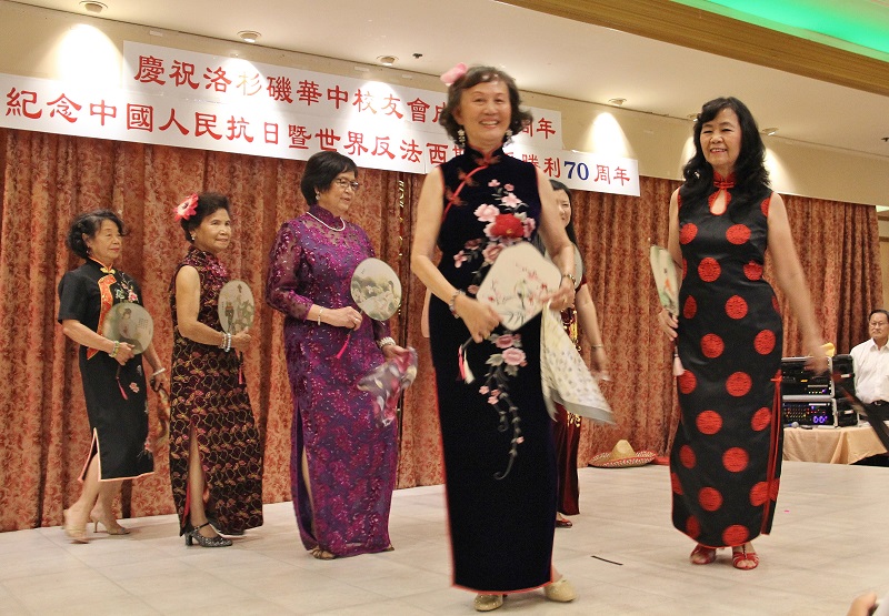 2015年8月15日南加州缅甸“华侨中学”校友会(简称华友)为纪念世界反法西斯抗战胜利70週年暨该校友会25週年在洛杉矶举办庆祝晚会,有20多个精彩的余兴节目。大合唱阵容壮大,衣著整齐亮丽,民族舞蹈的服饰颜色鲜艳独特。“唐装旗袍秀”更有发扬中华国粹的精神。诚如朱雪雪所说:中式旗袍最能呈现中国淑女的贤淑,典雅,温柔,清丽,是我最欣赏的女士服装。