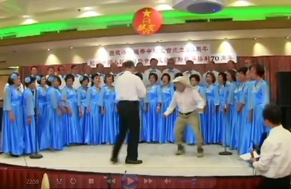四、黄河大合唱后有国军、八路军押解日本鬼子出场,我连续三次催国军叶国治学长换装而他纹丝不动,毫不在乎,稳坐席上,急得我不知所措,待到歌詠队列队登台,神不知鬼不觉,叶学长身着笔直国军军装与八路军张剑昌并肩,正接受观众影相,年过八旬而行动如飞箭,哈哈!