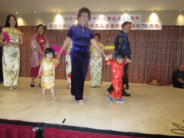 十、旗袍秀集体表演、唐装旗袍秀双人表演、旗袍秀个人表演接近尾声,舞台上突然出现一队人马,杨德欢陈彩意夫妇手牽两岁龙凤胎孙儿孙女登台,ㄦ媳妇及亲家随后,场面非常和谐热闹,观众席暴以热烈掌声。小孙女显得活泼大方,小孙男却脸露腼腆,他们很开心,因为他们是年龄最小的演员,与他们一样今晚上台表演的两位老演员比他们大八十岁,哈哈!