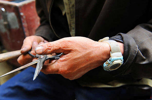 做裁缝的人缺不了剪刀。裁缝的剪刀又重又长,跟普通人家用的剪不一样。爸爸用的剪刀有两种,一是剪线用的比较小;另一种是裁剪用的,又大又长,一剪下去,半尺多长,齐齐整整。不过,时间长了,剪刀的刀口也会钝的,这时就需要磨利削钝。可是,磨剪刀是件细致活,有技术,挺讲究的。不懂的人,会把剪刀磨坏。爸爸的剪刀,自己从来不磨,都是请人磨的。