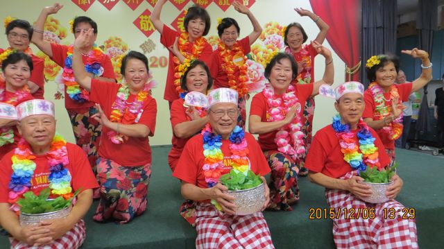 十二点正,随着黄会长上台致词,祝愿与会所有寿星心情舒畅、身体健康、长命百岁。何栢生眼科医生简短介绍老人眼保知识后,丰富多彩的文娱演出开始。首先由林碧华领演吉祥如意的缅甸泼水节舞,舞姿优美,歌声动听,深受寿星们喜爱,获得全堂掌声。接着庄玉娇老师领演的粤语父母恩典舞、闽南语爱拼才会赢舞先后登台,歌声优扬,舞姿翩翩,动作整齐,深受与会观众好评。还有吕良奇、丘丽琴夫妇领演的交际舞,陈幼群领演的双人舞,陈贵茂会友的剑舞,多姿多彩,目不暇接,与会观众大饱眼福。