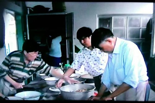 经龚会长通知安排,六七位能煮会炒的校友,18日一早就来到聚仙楼里的厨房帮忙,有的切肉,有的劏鱼,有的炸肉丸,有的烧烤肉排,有的炖鸡肉;龚会长也亲自操刀和掌勺,我的两个堂弟张富林、张富盛,因父亲生前在摩谷开饭店,他们也学到一手好厨艺;当日还雇请两位缅甸妇女来帮忙洗菜洗碗碟;不会做菜的校友就在大堂剥蒜头、葱头。大家协力合作,有说有笑,干得很起劲。