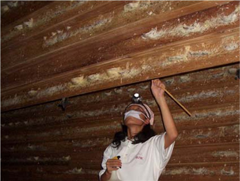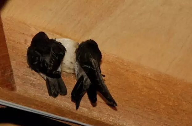 打开门锁进去后,只感到一片漆黑。打开带来的手电,才发现里面有金丝燕飞来飞去,有的燕儿就栖息在房梁上。房梁上可见到它们的燕窝排成一列;这些燕窝现在可以说是价值连城了。在这里有必要介绍一下这些金丝燕的生活习俗了。