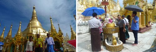 弟弟是个虔诚的佛教徒、20日上午他特地带我们去朝拜世界著名的大金塔、按规定我们每人付了缅币8千元参观费。在缅甸期间我们的吃住穿行、购买所需用品小弟全包、不让我们手付分文、唯独参观费叫我们自己出、因为此乃行善集德。儿子穿短裤露膝头不行、管理处给他换穿沙龙、虽然不习惯他显得格外得意、21年前他来过一次、此次旧地重游、目睹宏伟的大金塔顶尖直入蓝天、在阳光照射下金光闪闪、金碧辉煌、心中大喜、拍了许多相并给他星期二生日坐佛沐浴求福 。